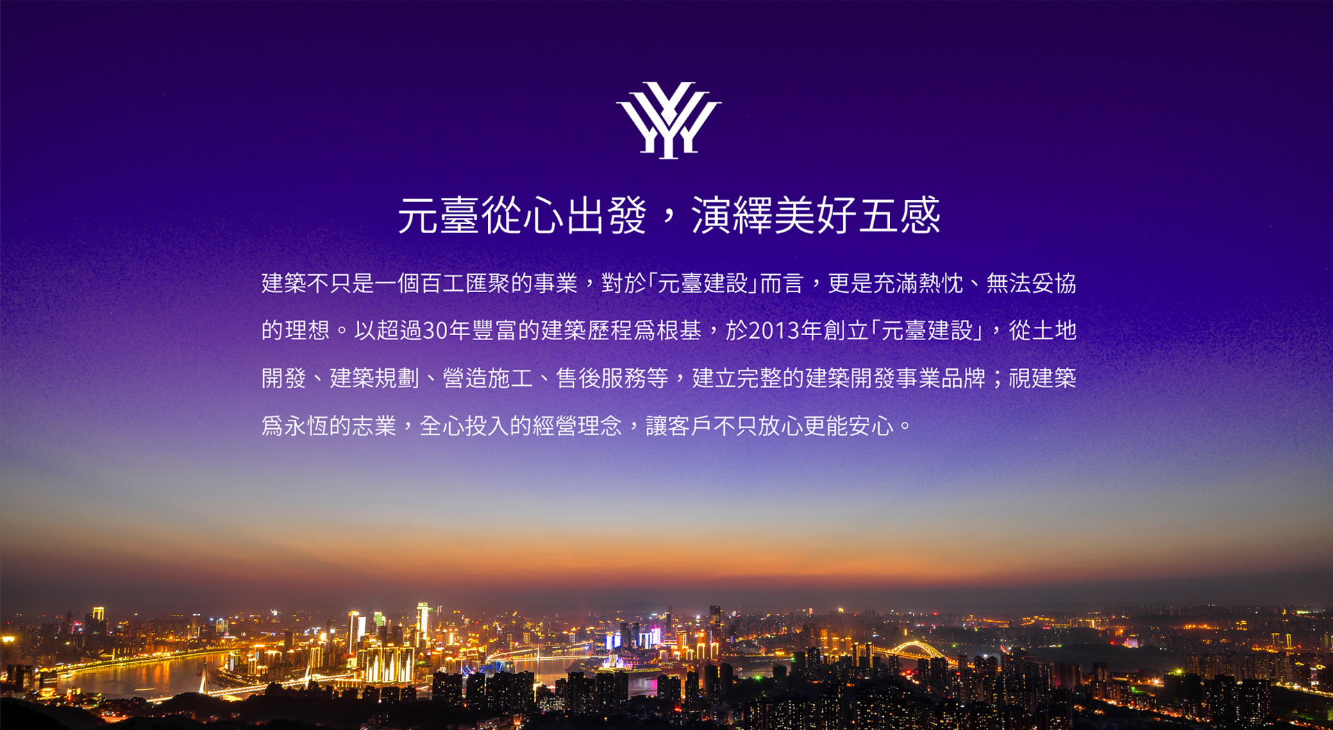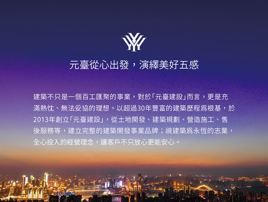 建築的個性,可以返璞、可以歸真;建築的質感,需要用心體會閱讀。「元臺建設」將手造藝術的細膩,融入建築創作人文思維,每一個不同尺度的建築作品,都是淬鍊元臺深邃文化的精品美學,不斷自我鞭策、自我超越,時時刻刻追求完美,不到極致境界,絕不妥協!
